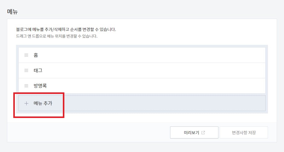 티스토리 관리메뉴에서 꾸미기 카테고리에 있는 메뉴를 클릭하면 메뉴추가를 할수가 있습니다.