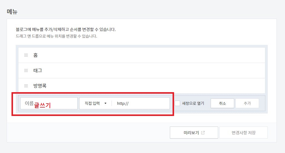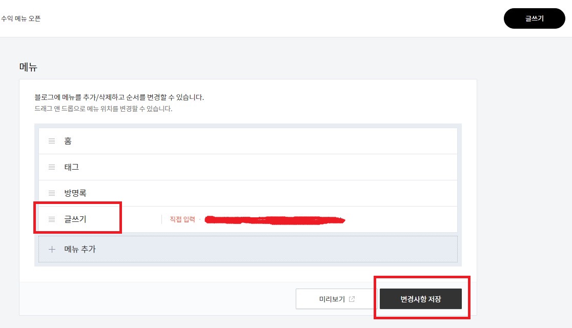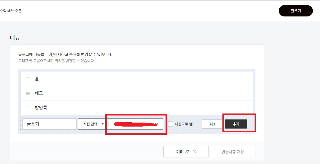 글쓰기의 링크주소를 붙혀넣기 한 후 추가를 클릭하면 메뉴에 글쓰기가 보여집니다.