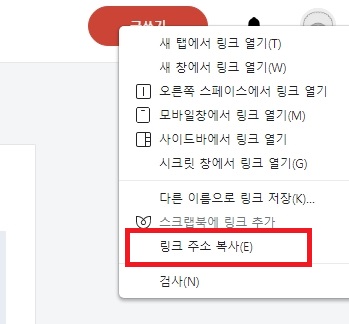 글쓰기 버튼에 마우스 우클릭을 하면 아래 화면처럼 링크 주소 복사가 나옵니다.