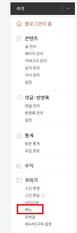 그러면 티스토리 관리메뉴중 아래쪽 꾸미기에서 메뉴가 보입니다.