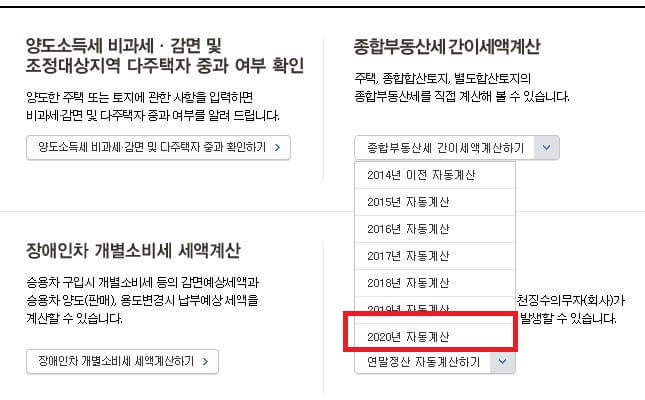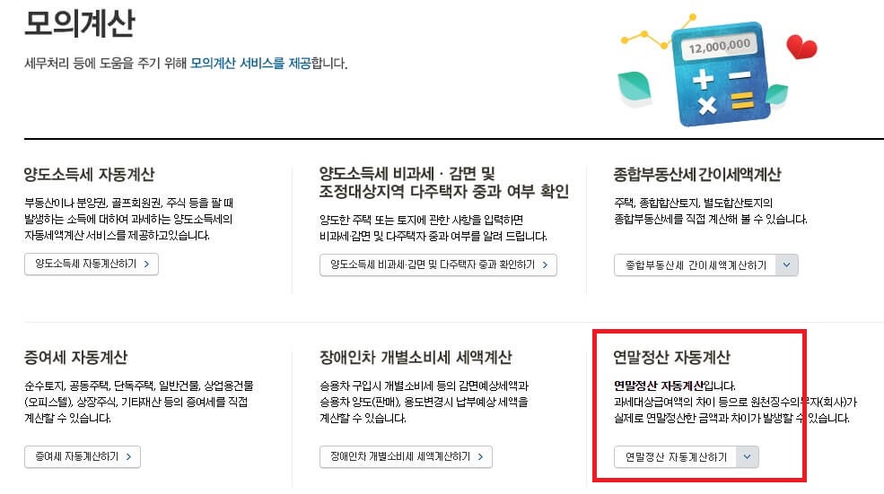연말정산 모의계산에 들어가면 2020년 연말정산 자동계산을 할수있으며 다른 세금인 양도소득세와 종합부동산세등도 계산을 해보실수가 있습니다. 두번째 줄 아래에 있는 연말정산 자동계산을 클릭해줍니다.