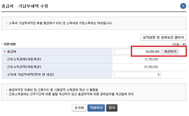 본인의 총급여가 얼마인지 알아야 연말정산 자동계산을 해볼수가 있겠죠? 총 급여가 6천만원이라고 가정하여 계산을 해봅니다. 금액을 입력하고 오른쪽의 계산하기를 눌러주면 됩니다.