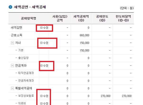 이번에는 소득공제 계산하기입니다. 소득공제항목은 인적공제부터 시작해 연금, 주택자금등 본인이 한해동안 사용한 금액이 포함됩니다. 연말정산 자동계산시 필요한 항목을 + 수정버튼을 눌러 입력을 해주면 되는것입니다.