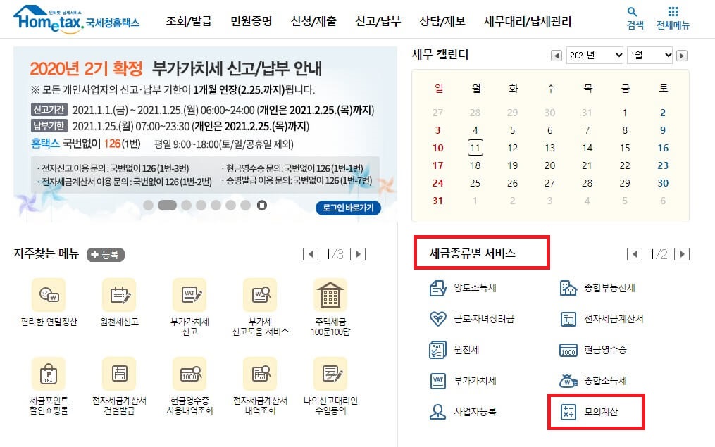 연말정산 자동계산을 이용하고자 하는분들은 홈텍스에 들어가주세요. 그리고 2020년 연말정산 간소화서비스는 2021년 1월 15일에 열립니다. 이 기간에 홈텍스를 이용하시면 연말정산 간소화서비스를 이용하여 쉽게 자료를 출력하실수가 있습니다.