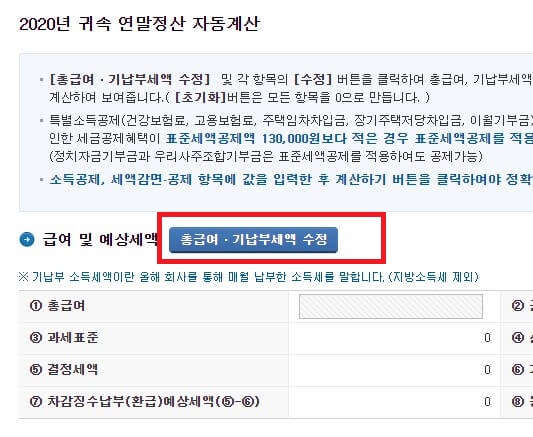 메뉴에서 2020년 연말정산 자동계산하기 버튼을 누르면 자동계산이 됩니다.