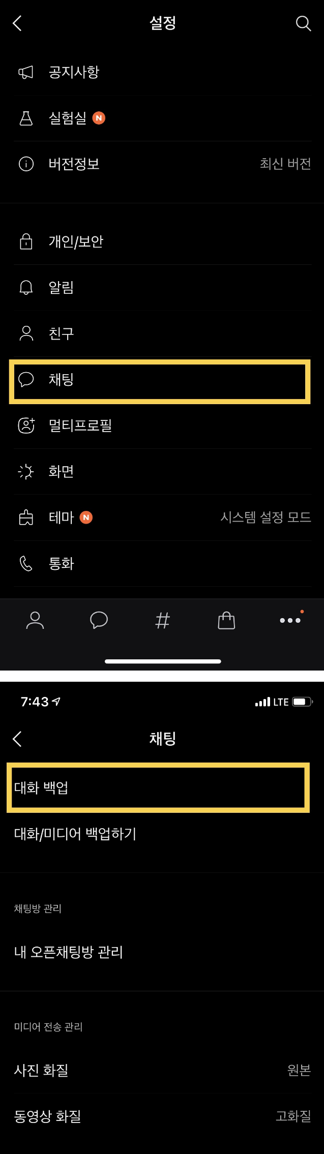 톱니바퀴 모양의 설정을 누르면 전체설정이 나옵니다. 여기서 채팅을 선택 - 대화 백업 선택 - 대화 백업하기 선택