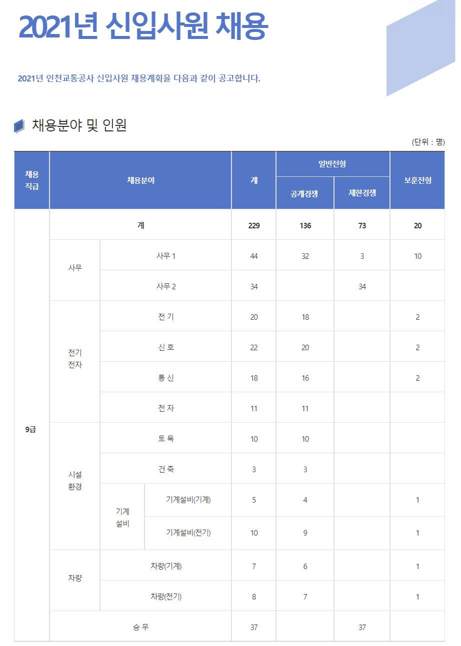 인천교통공사에서 2021년 신입사원을 채용합니다. 총 229명이며 원서접수는 7월 15일까지 입니다.